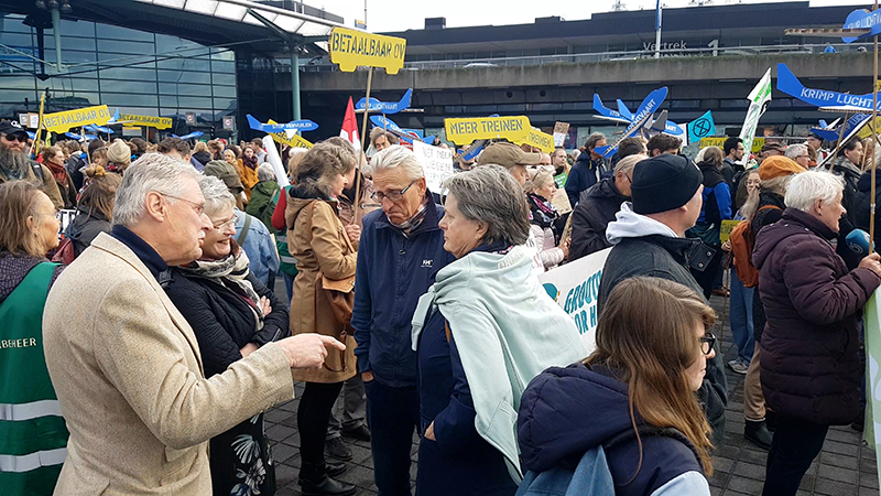 The action ran parallel to a peaceful and massive protest in front of the main entrance of the airport, co-organised by our Schiphol members. The border police had concentrated on that and were completely surprised by the well-prepared action of the Extinction Rebellion on another part of the extensive Schiphol site.